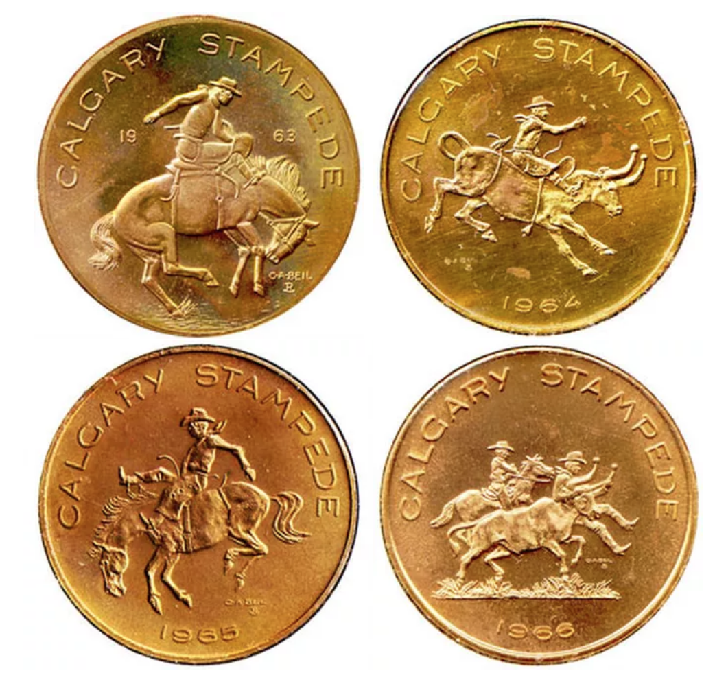 The production of commemorative numismatic items for the Calgary Stampede dates back to at least 1925, but Trade Dollars, valid as legal tender in Calgary during the Stampede, were first produced in 1963. The illustrations above show the reverse of the first four trade dollars, designed by the prominent Alberta artist, Charlie Beil.